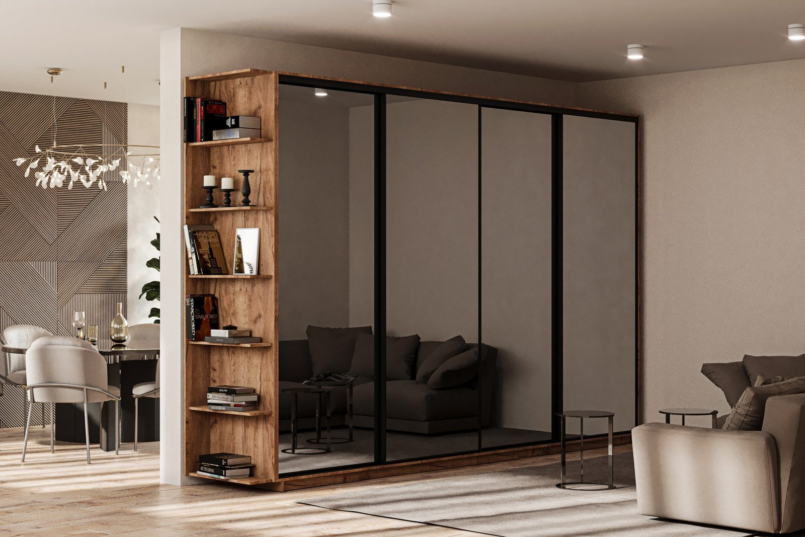 У вітальні шафи купе можуть виконувати роль не тільки місця для зберігання, але й декоративного елемента. Часто вони оснащуються відкритими полицями для книг або декору, вбудованим освітленням або навіть телевізійною нішею. Такий підхід робить шафу купе центральним елементом кімнати.